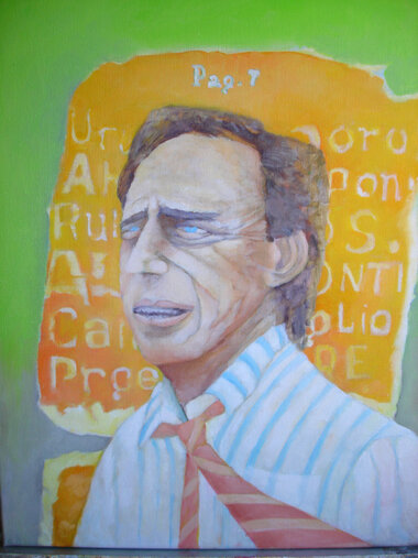 Composicion de raigambre o poso clasicista: medio perfil a tres cuartos por debajo del hombro, que es actualizada incorporando un dialogo con las aportaciones de la pintura moderna: Movimiento (de la corbata y las rayas paralelas) juego iconográfico: se sustituyen atributos clásicos de representacion de un poeta, por una cali-grafia que actúa como atributo a la par de elemento culto, cita (con la pagina) es muy divertido y genial, porque actúa como cita artística (el arte habla del arte) y como cita culta al y del autor retratado, y finalmente como atributo distintivo, lo mejor es que dicha grafía construye pintura, es motivo de la construcción de una pantalla visual, con referencia al volumen y a un objeto identificable(pergamino, piedra...) Sobre esta pantalla y en primer termino la construcción de la figura nos desborda: Práctica de una pintura de toques cortos y pinceladas algo mas largas y diluidas, sin poco espesor, de una gran cantidad de tonos, de oscuro a claro, y viceversa, sin necesidad de perfilar y acotar, configurando un mapa orográfico, escarpado, profundo volumétrico, de gran expresividad y que abren el retrato a un terreno psicológico, si alejamos la vista, comprendemos que hay una captación del instante, el momento ideal que diría Lessing, un momento de fuerza narrativa. Asi pues nos debatimos entre el símbolo del icono creado y la narración que oculta la expresión de la cara, el ceño fruncido, del que se enfrenta a su existencia con actitud introspectiva, su mundo interno, el del poeta alumbrado por dos faros, dos pedacitos de cielo llenos de fuerza. El personaje esta vivo, tan vivo que los colores nos inundan, frescos, vaporosos, no pesan, parecen inflarse como soplo dado por el viento del norte, llamado Boreas, colores del hielo que solo manejaron con acierto los hombres del norte Chagal, Kandisky....Que